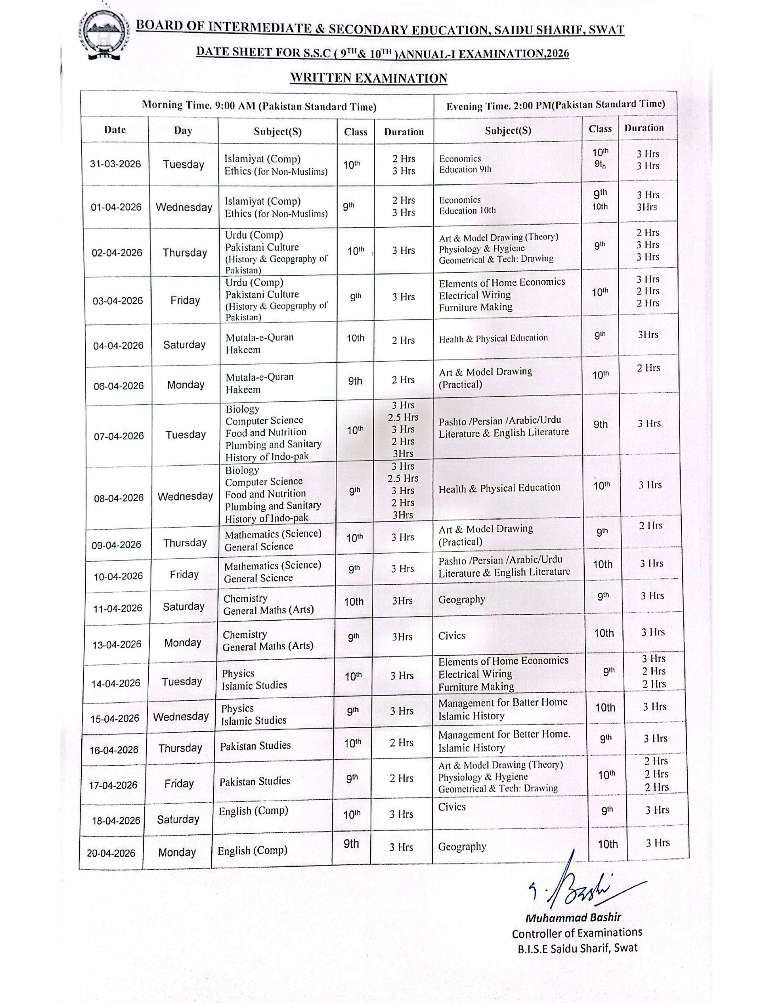 According to the recently announcement, the annual exams will start from April 1st, 2026.. Students are advised to stay tuned for the latest updates and prepare accordingly. The BISE Swat 9th class date sheet 2026 has provide the schedule for all subjects, helping students plan their study routine effectively. Once 9th class datesheet 2026 announced, it has been uploaded on our website. Keep visiting our site regularly to stay updated.