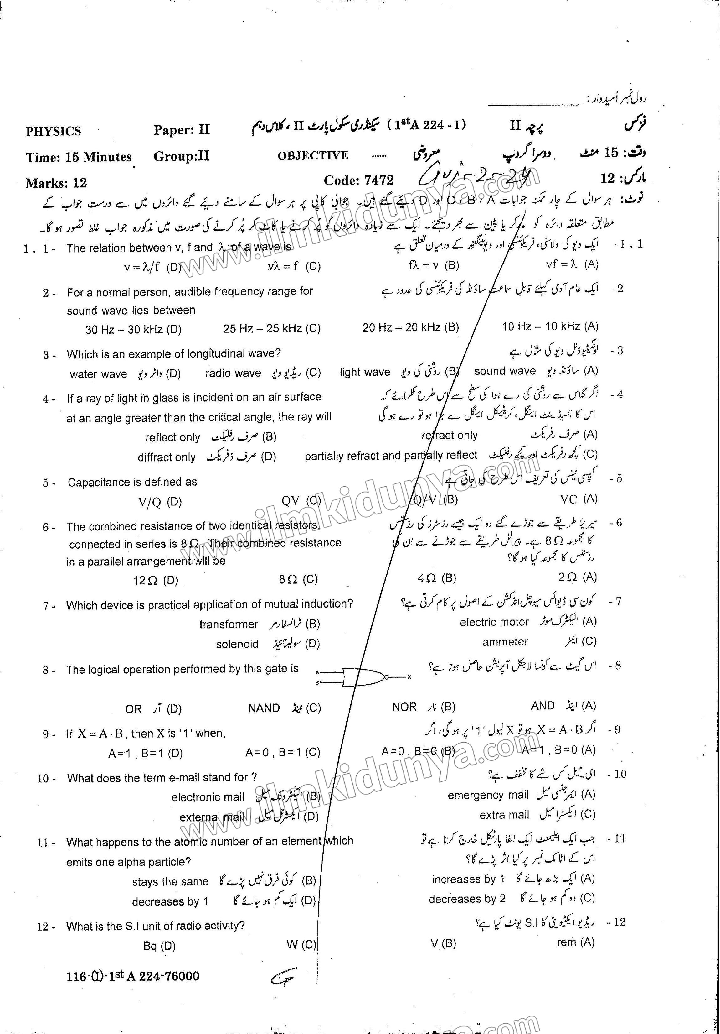 10th Class Physics Past Papers 2024