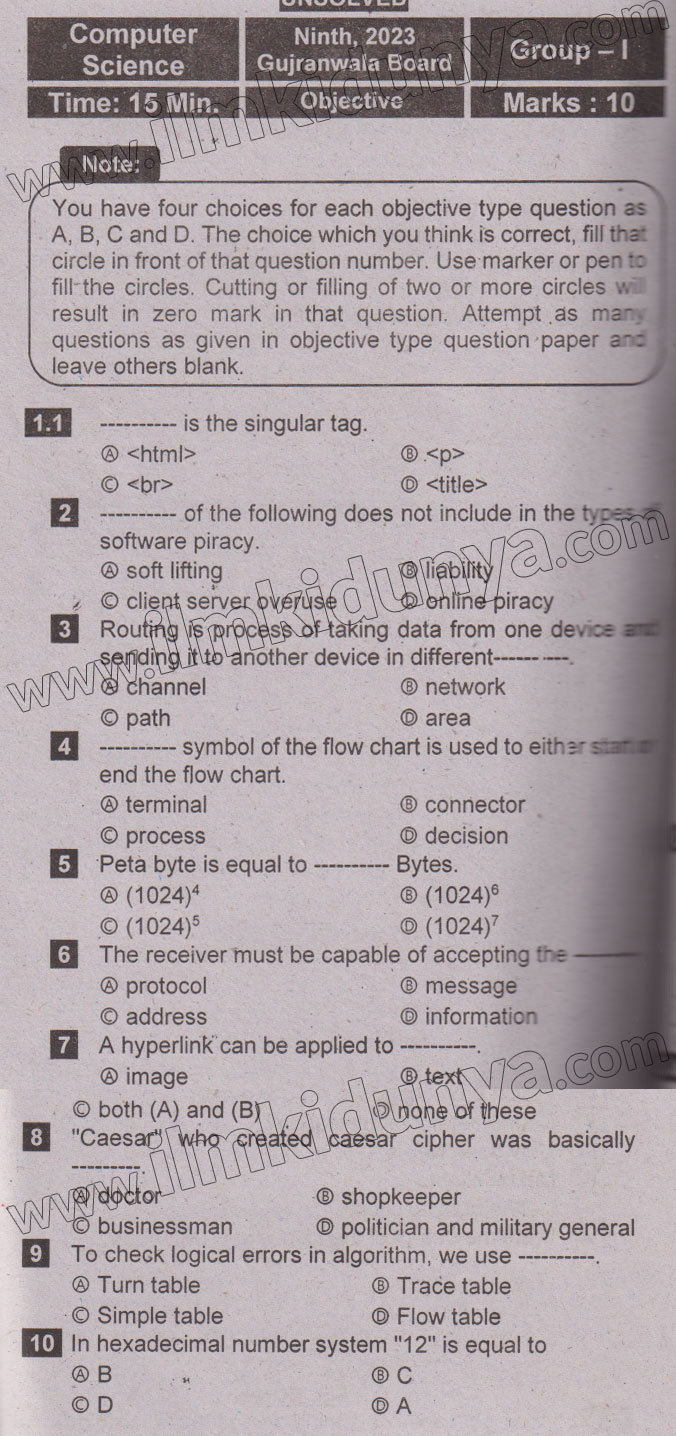 - The 9th Class Computer Science Past Papers for Gujranwala Board are now available.