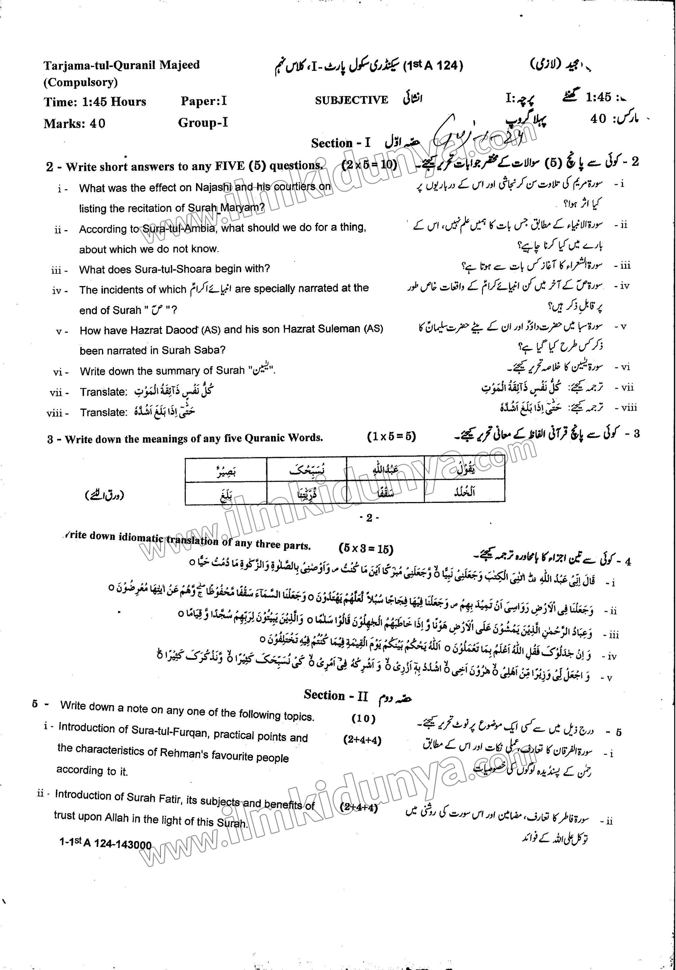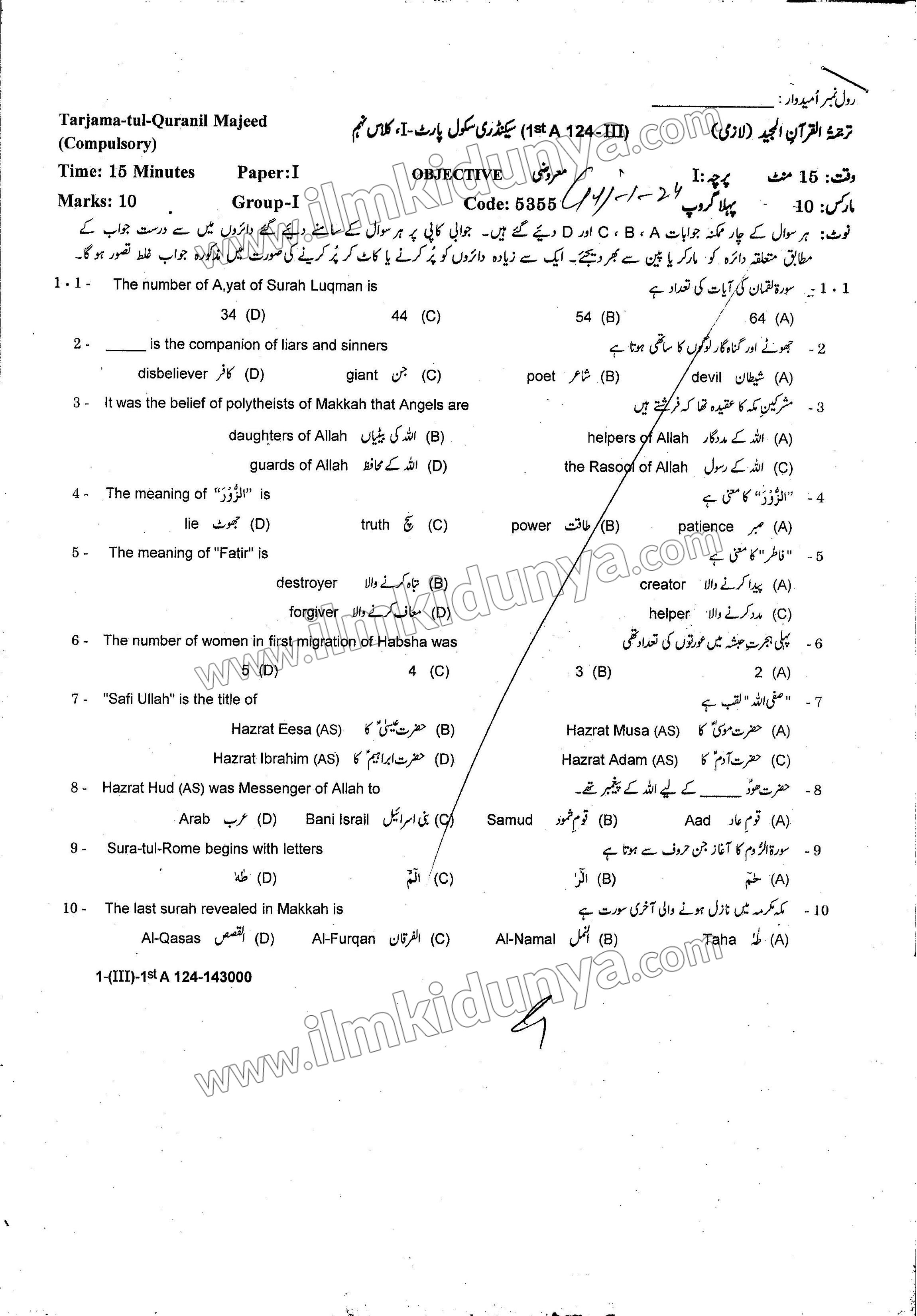 9th Class Tarjuma Tul Quran Past Papers 2023