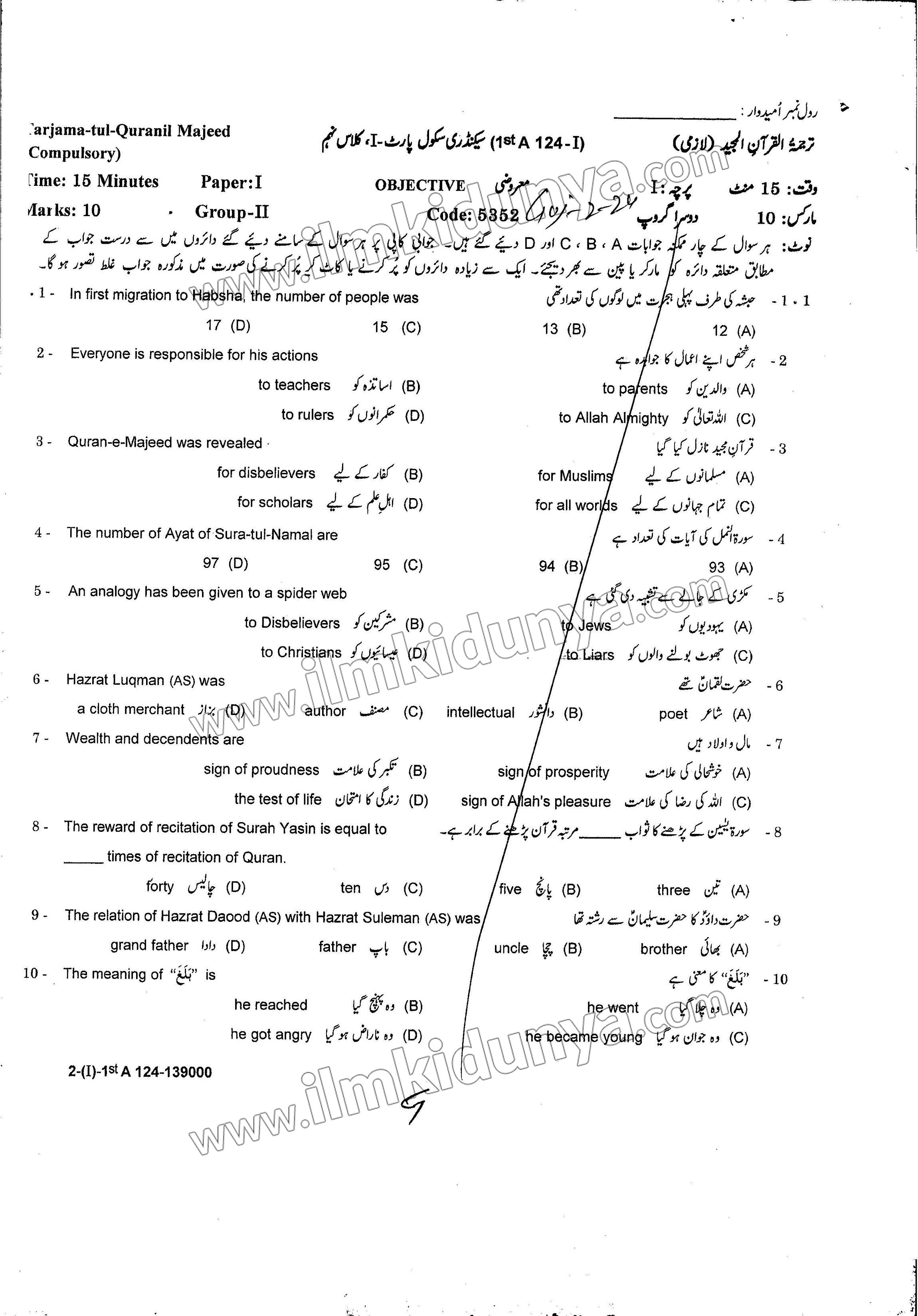 9th Class Tarjuma Tul Quran Past Papers 2022