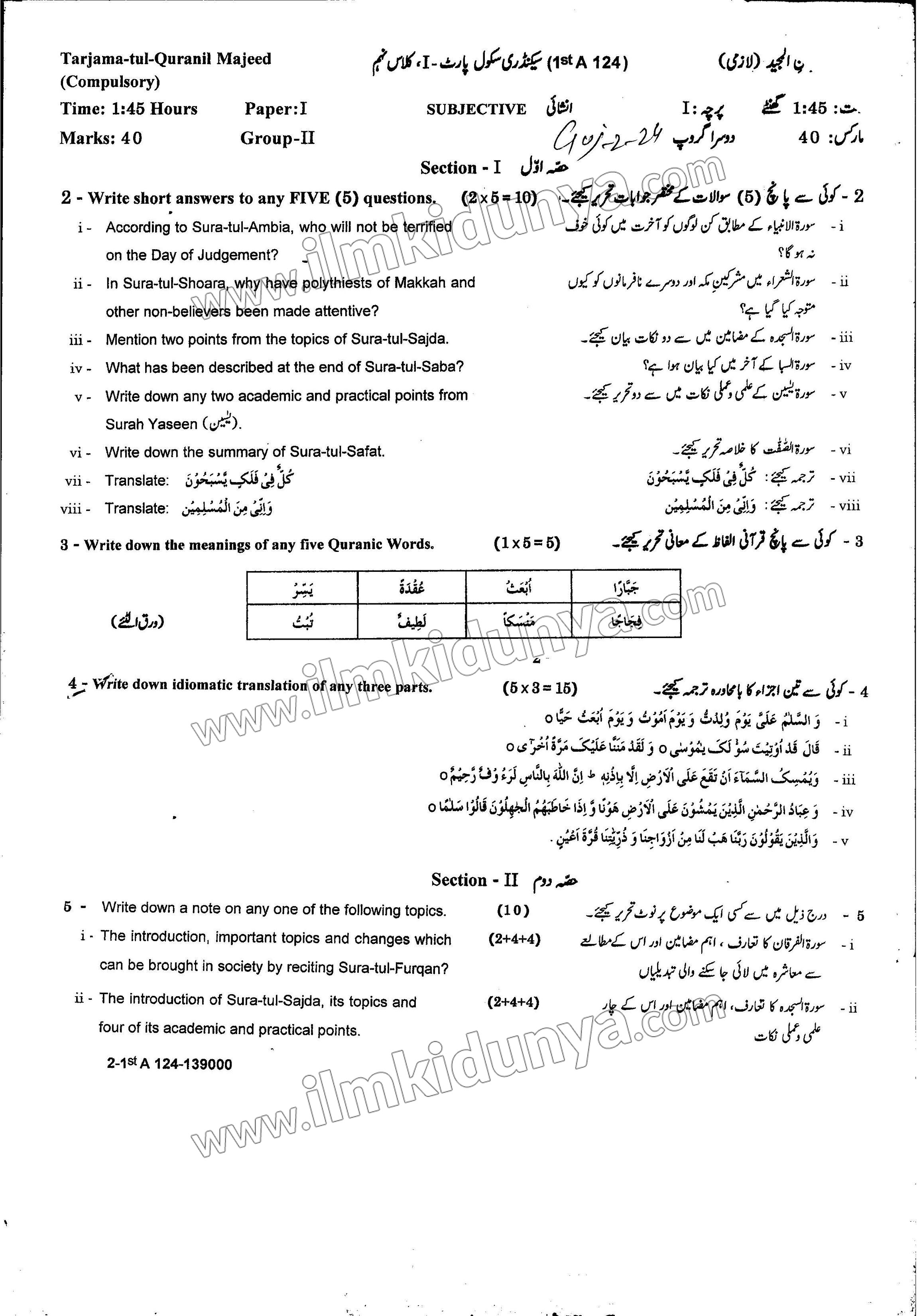 9th Class Tarjuma Tul Quran Past Papers 2024