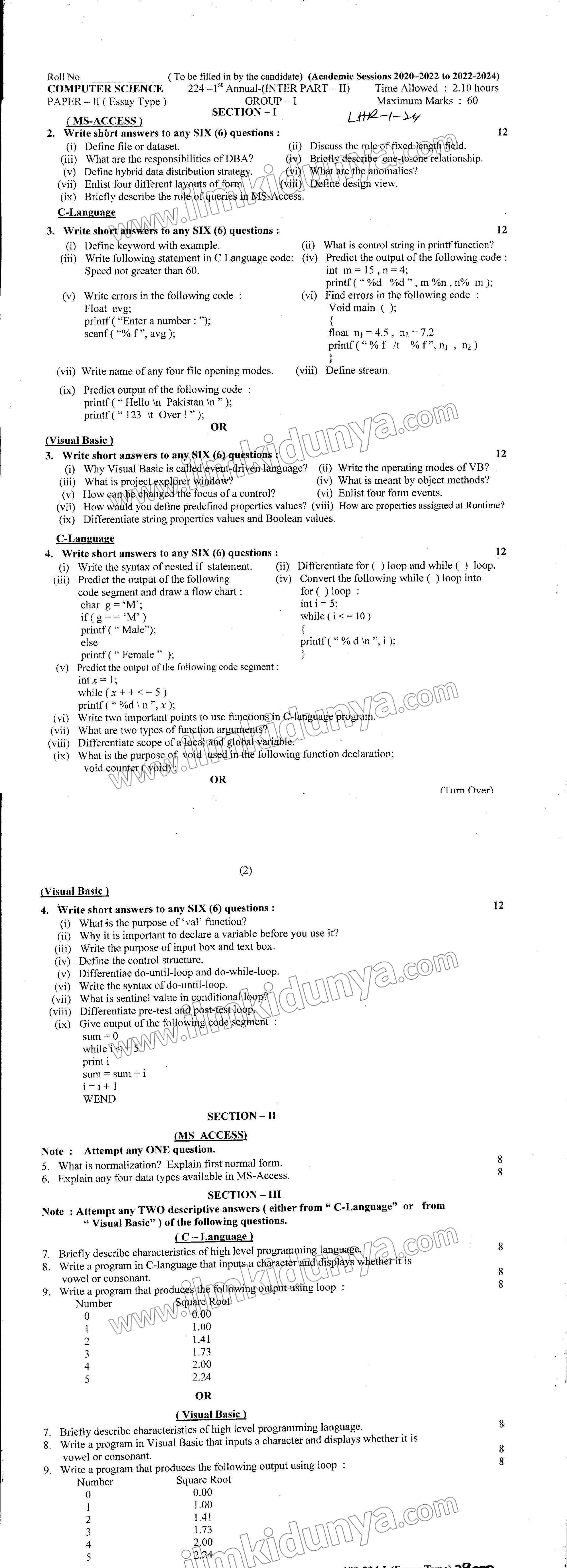 | 12th class Computer Science Subjective Group 2 | View/Download |