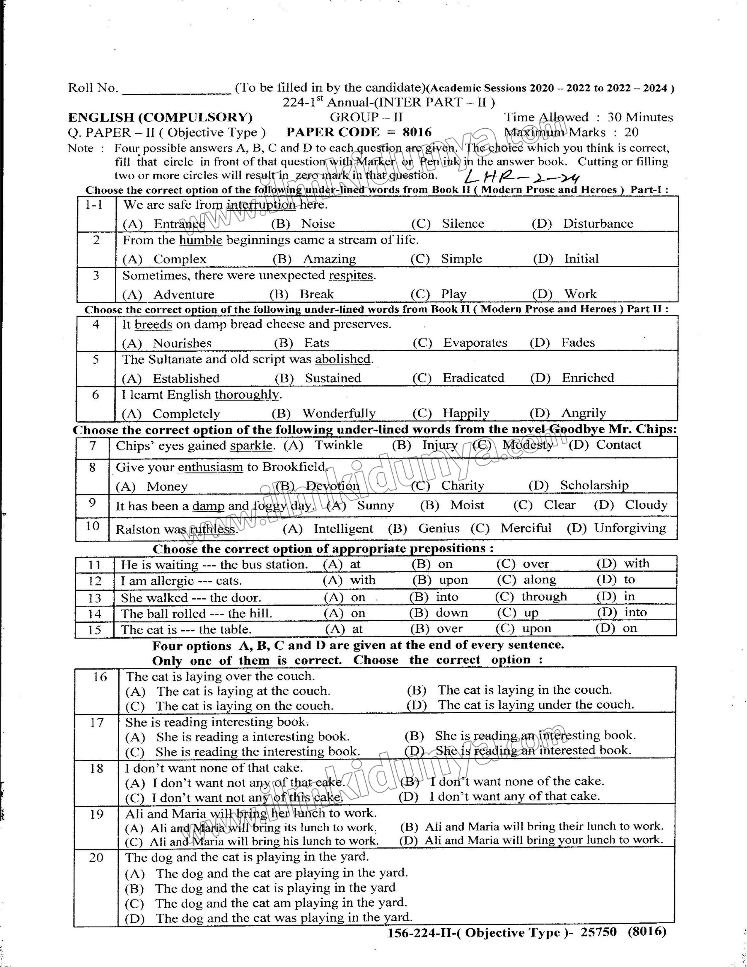 | 12th class English Objective Group 1 | View/Download |