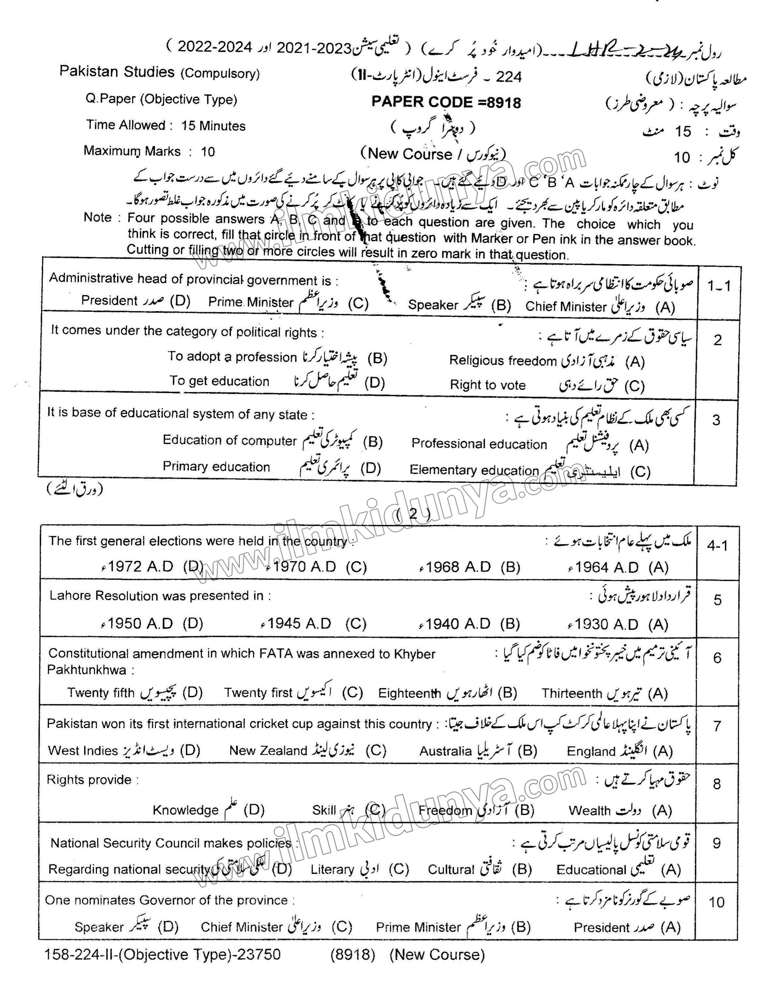 | 12th class Pak Studies Objective Group 2 | View/Download |